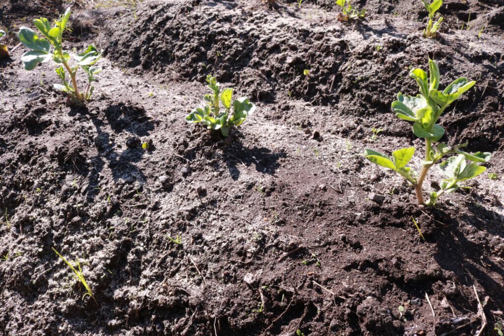 そら豆の追肥1回目・・・開花初め頃。追肥と一緒に中耕・土寄せも行います。